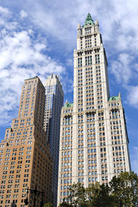 建于1913年242米高的伍爾沃斯大廈,是當(dāng)今美國(guó)紐約一座漂亮的地標(biāo)性歷史建筑,它第一個(gè)將所有真正摩天大樓的組成部分融為一體,成為當(dāng)時(shí)世界上最高的摩天大樓。由密集的鋼梁和混凝土組成的龐大基礎(chǔ)擔(dān)當(dāng)著支撐建筑物鋼結(jié)構(gòu)的任務(wù),以抵御預(yù)計(jì)產(chǎn)生的風(fēng)力。創(chuàng)新的高速電梯提供60層運(yùn)送服務(wù)。