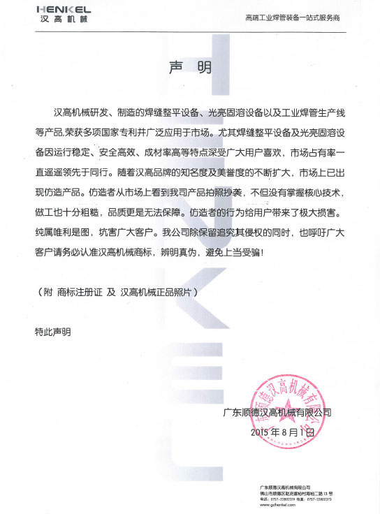 近期,有客戶宣稱某些公司借著漢高機械的名氣,向客戶出售山寨設(shè)備,影響信譽,故此發(fā)表聲明