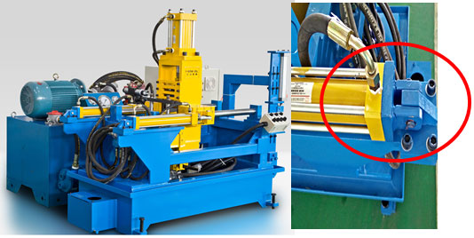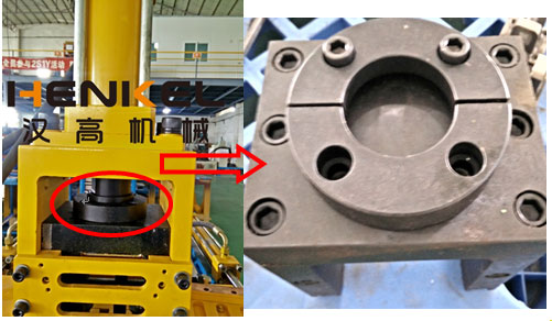 四、漢高正品的油缸連接座上,線切割油缸連接塊,保證了同心度又加強(qiáng)了穩(wěn)定性;仿制品則隨便用兩塊壓片固定,不安全的同時(shí)壓管效果也不好 。如下圖所示: