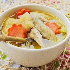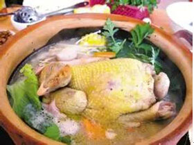 做法:將老母雞放血宰殺,拔毛、去內(nèi)臟,然后洗凈、切成大塊。把生姜洗凈(不要去皮),再拍扁。瓦鍋洗凈,放進老母雞、艾梗、生姜;加入清水。先用猛火燒開,煮約5分鐘后,轉(zhuǎn)換成小火煮,以水面有滾沸為度,約煮1.5~2小時即可。調(diào)入適量的精鹽即可飲用。