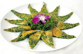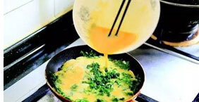艾葉洗凈后剁碎,加入雞蛋攪勻,加入鹽、胡椒粉,鍋熱加油,煎熟即可??僧敳讼嘛?,令人開胃。